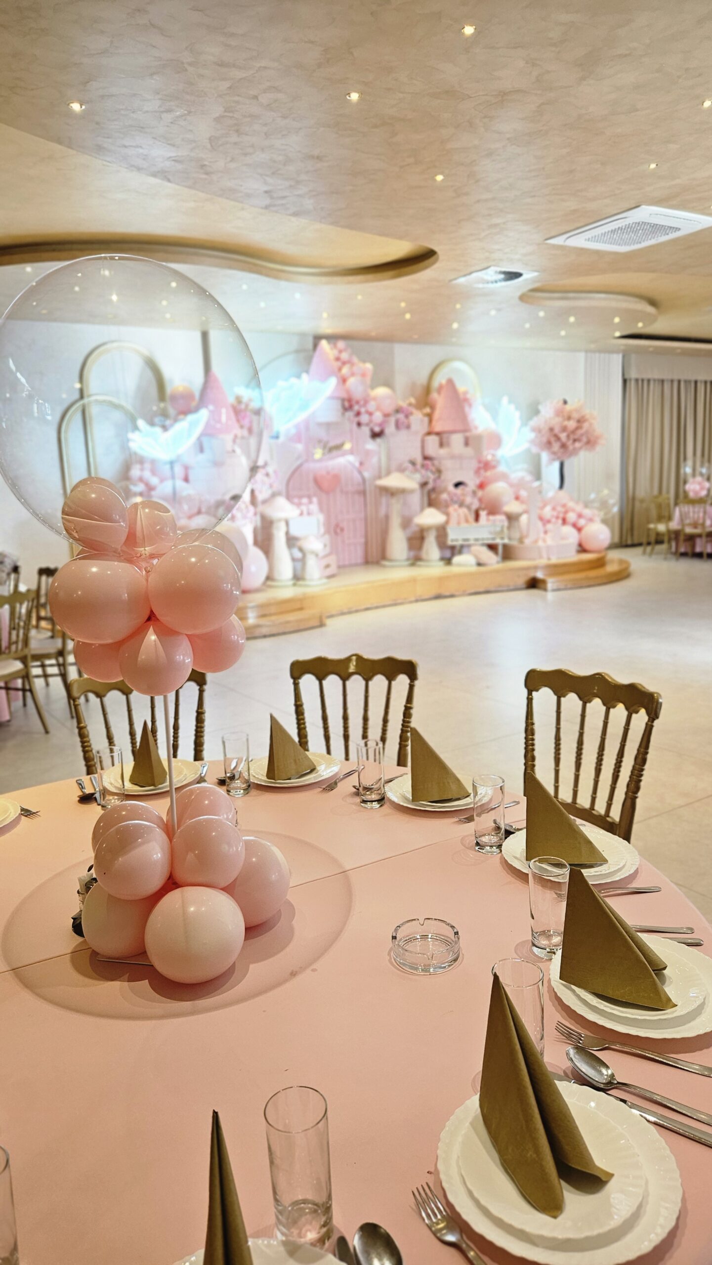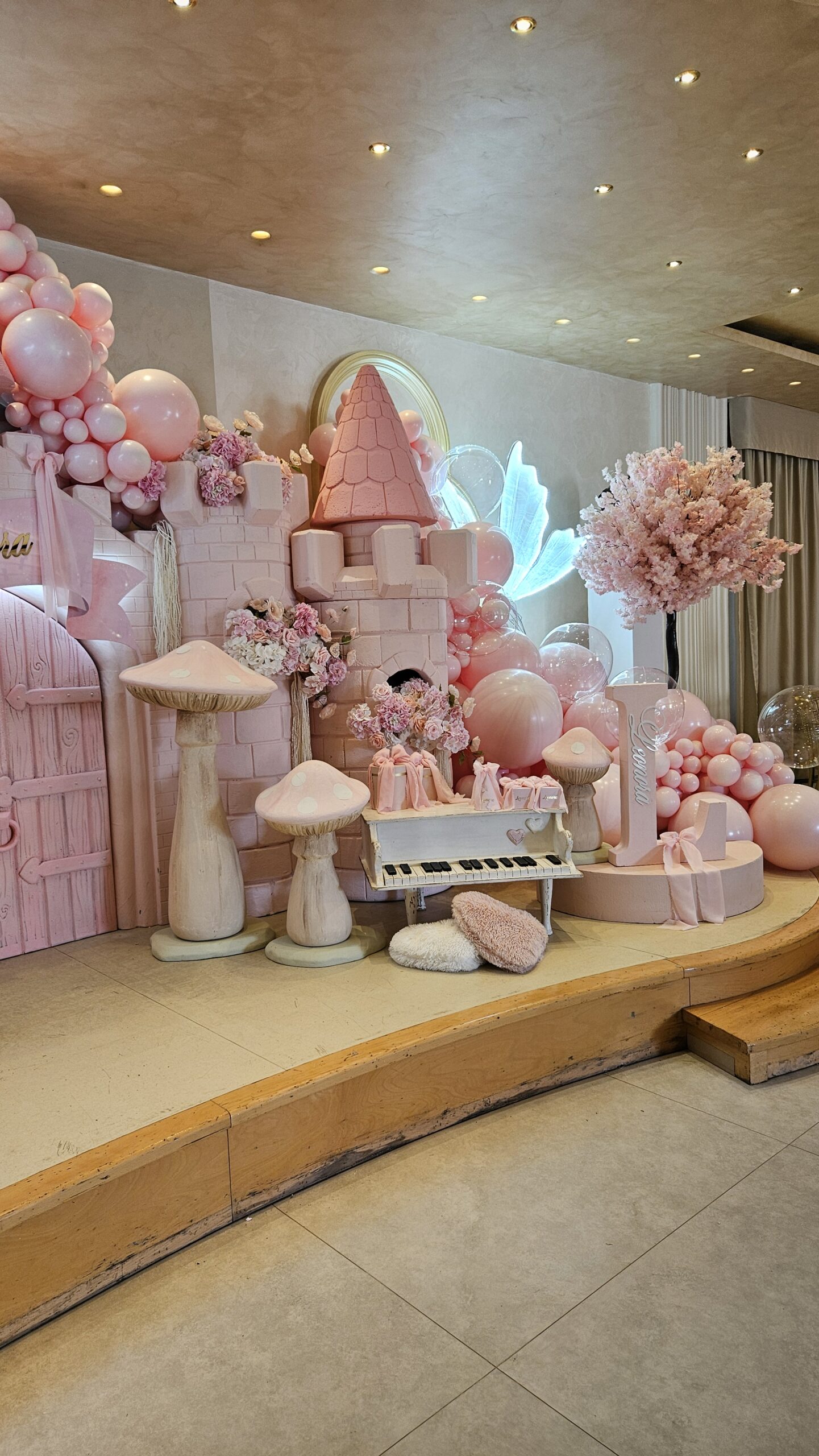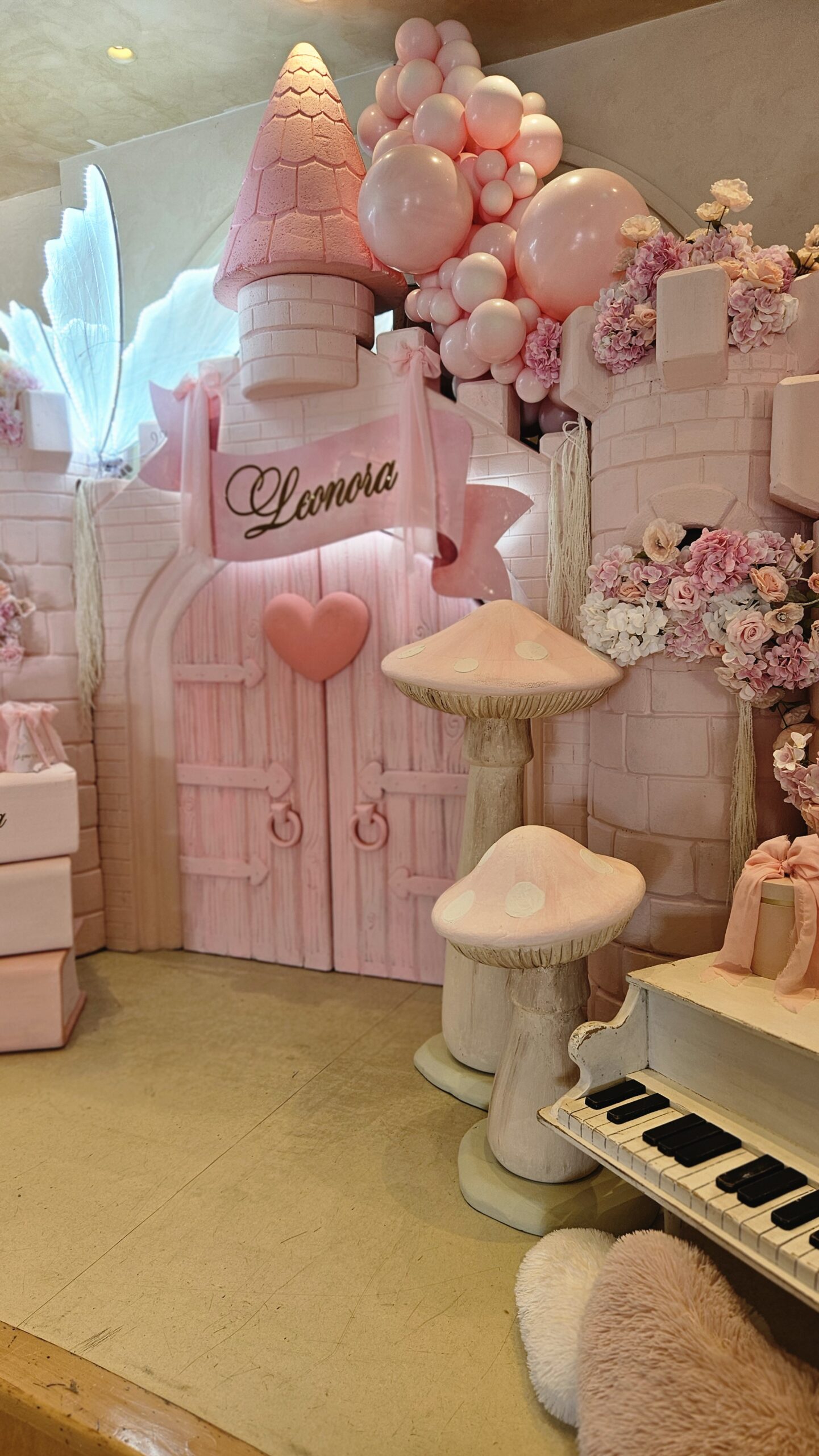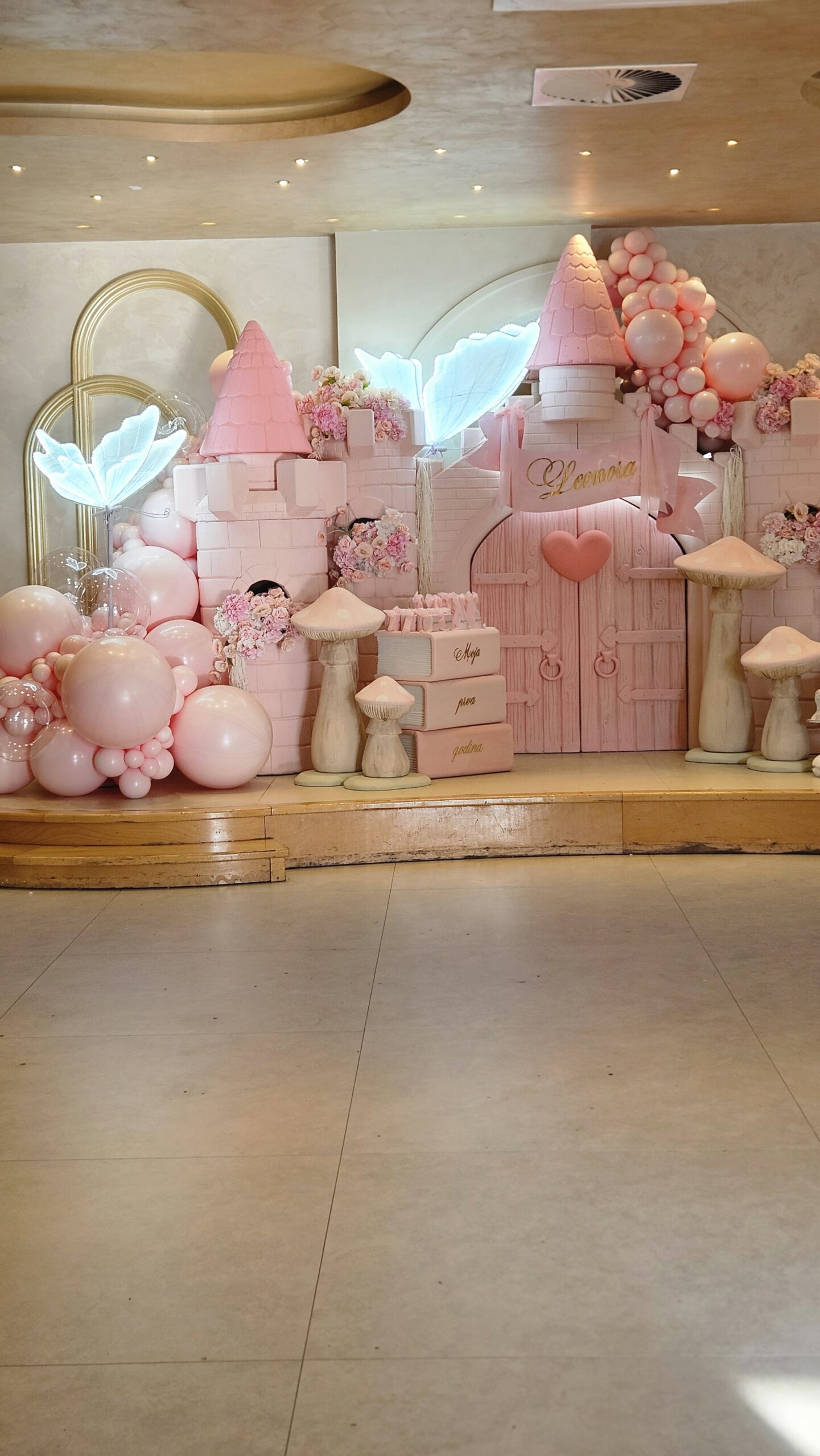 Centralni motiv bio je raskošni roze dvorac, okružen nežnim cvetnim aranžmanima i morem balona u roze boji. Ovaj bajkoviti ambijent stvorio je savršenu pozadinu za slavlje male Leonore, koja je tog dana bila glavna junakinja svoje čarobne priče.