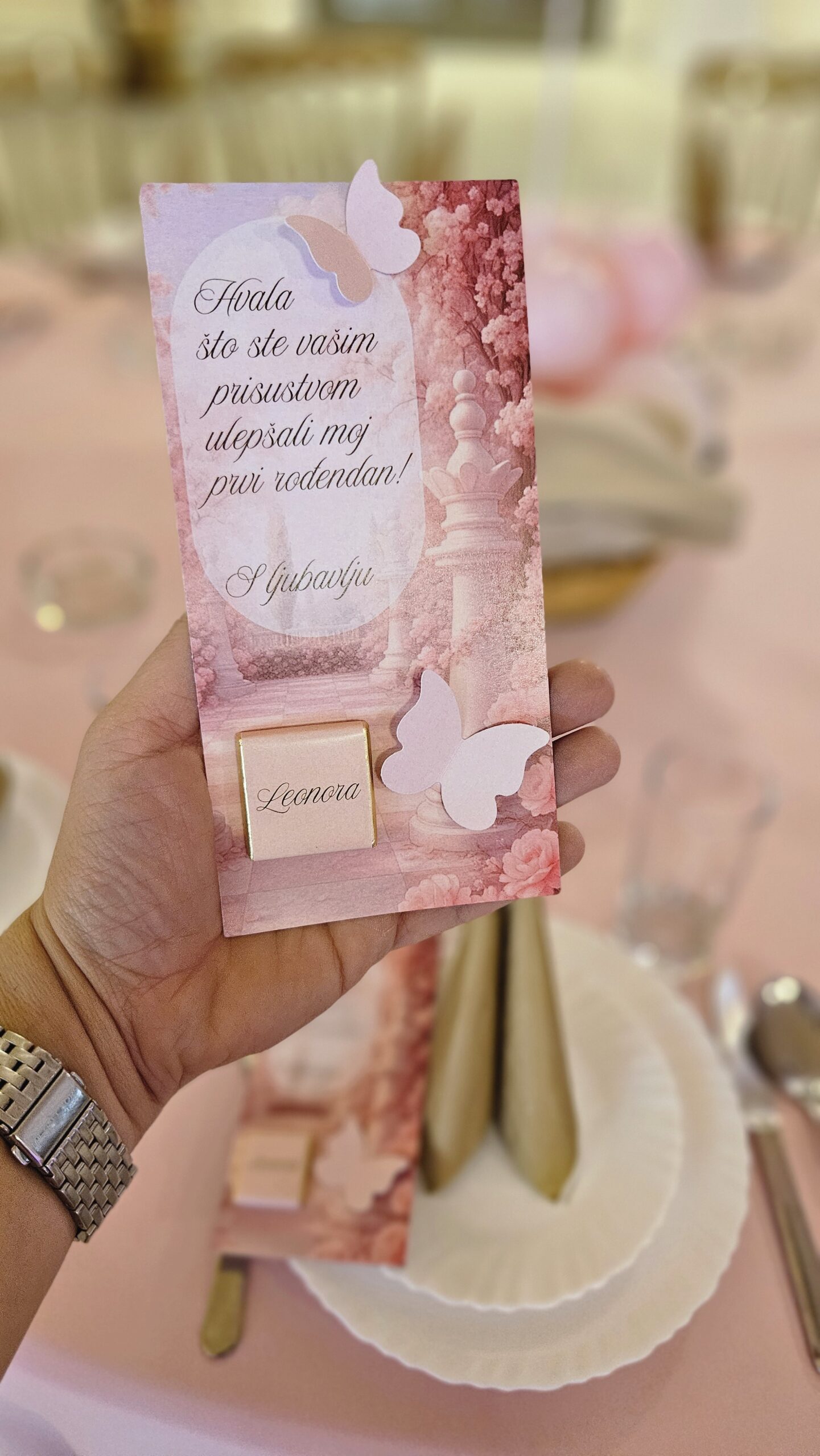 Him & I je doneo magiju, sklad i bajkovitu eleganciju kroz roze dvorac, cvetne detalje i nežne balone koji su Leonorin dan pretvorili u pravi čarobni svet. Personalizovane zahvalnice sa čokoladicom upotpunile su atmosferu, ostavljajući svakom gostu mali deo te bajke.