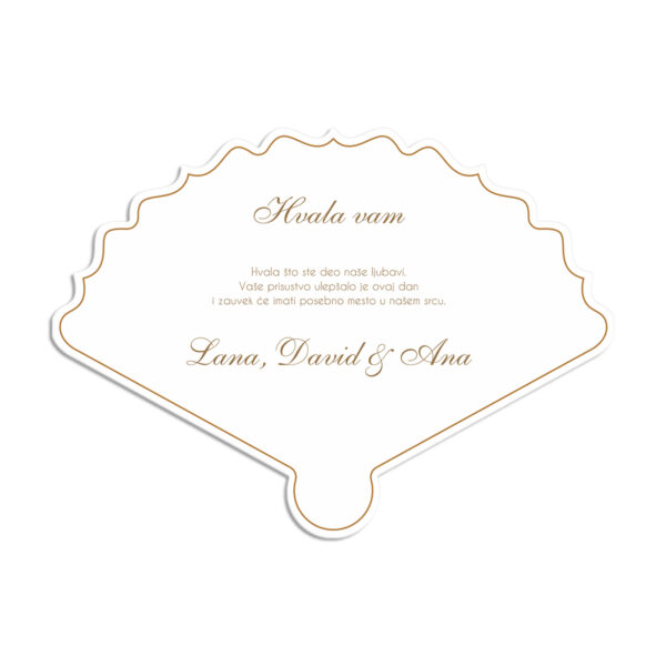 Lepeze od papira predstavljaju savršen spoj elegancije i funkcionalnosti. Kao zahvalnice za goste, one su originalan i praktičan detalj koji osvežava tokom proslave, a istovremeno ostaje kao uspomena na vaš poseban dan.