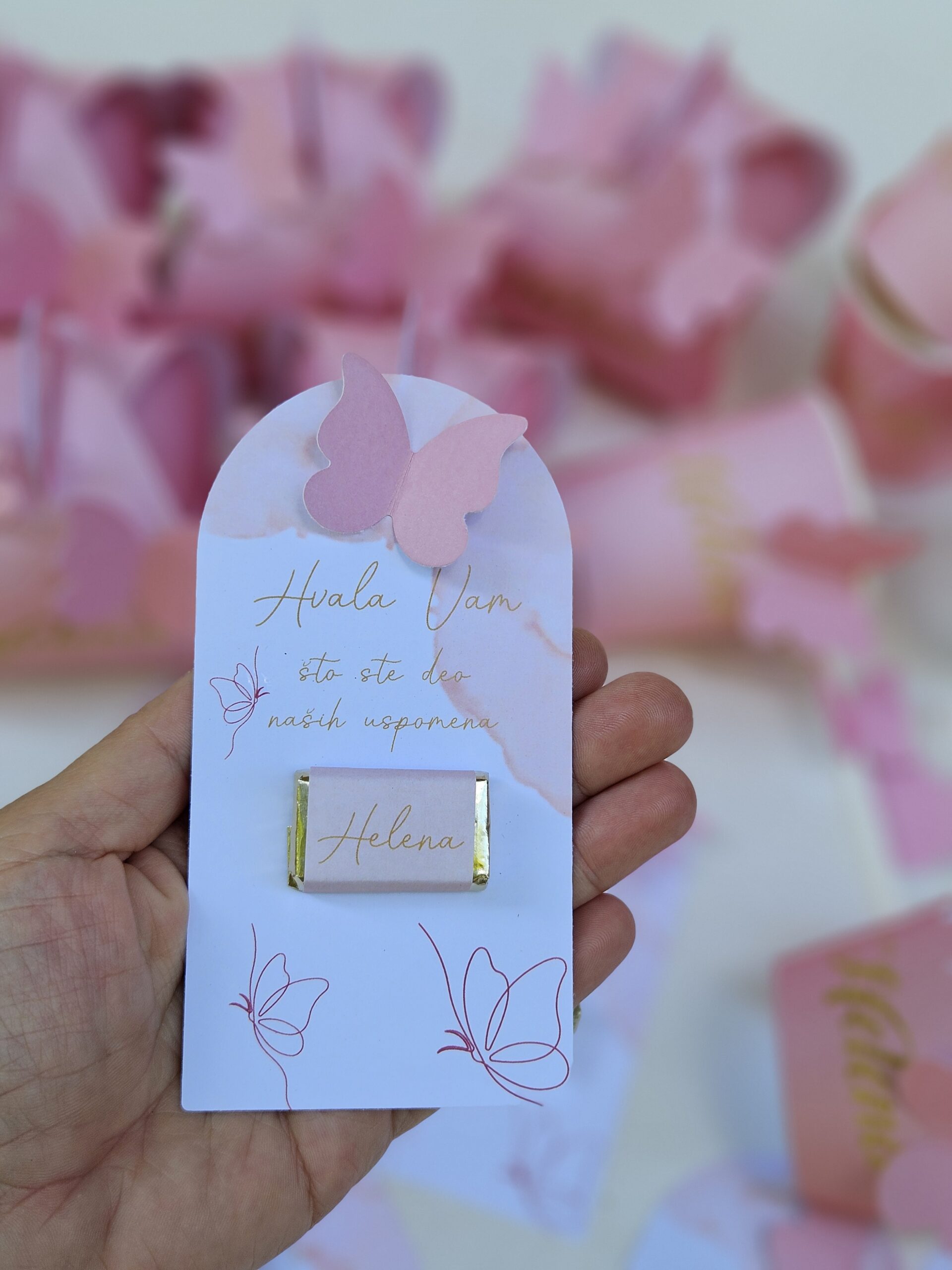 Popularne zahvalnice za goste sa ili bez čokoladicom možete unikatno dizajnirati na našem portalu sa tekstom, sličicama i u različitim bojama i dezenima. Čokoladice mogu da budu mlečne ili 100% crna čokolada.